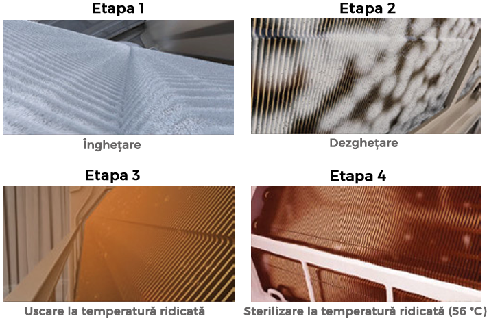 La aparatul de aer conditionat ALIZEE Pro AW24IT2, puteţi activa periodic un ciclu automat de curăţare, care constă în îngheţarea rapidă, apoi dezgheţarea evaporatorului, uscarea acestuia, urmată de o etapa de sterilizare la temperatura de 56°C, element de noutate. Datorită acestei funcţii, perfecţionată, faţă de alte tehnologii existente, prin adăugarea etapei de sterilizare, rata de eliminare a bacteriilor de pe evaporator este de peste 93,18%.
