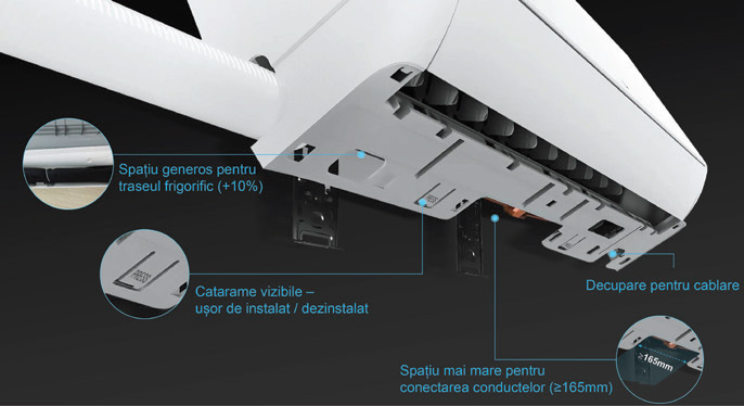 Carcasa unității interioare este prevazută cu o decupare specială, pentru conectarea ușoară a cablajului, și cu spatiu pentru traseul frigorific cu 10% mai mare, comparativ cu alte aparate.