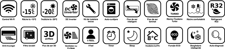 Pentru toate capacitățile, aparatele de aer condiționat includ kit de instalare, care conține 4m de țeavă, 4.3m de cablu, tub pentru drenajul condensului, bandă de matisat și protecție a traseului la trecerea prin perete.