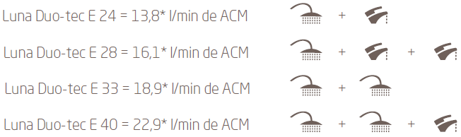 * Producția de apă caldă menajeră fără limitator de debit la ΔT=25 °C; consum duș mediu fără limitator de debit: 10 l / min; consum mediu robinet fără limitator de debit: 4 l / min.