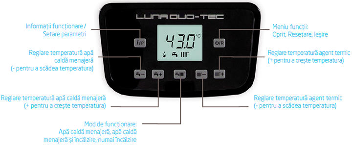 Gama de centrale Duo-tec E este prevăzută acum cu un nou panou digital de comandă, cu afișaj LCD retro-iluminat, ușor de utilizat datorită butoanelor dedicate și independente pentru setarea temperaturilor apei calde menajere și agentului termic pentru încălzire. Ecranul afișează informații despre modul si parametrii de funcționare ai centralei și permite setarea rapidă și ușoară a acestora