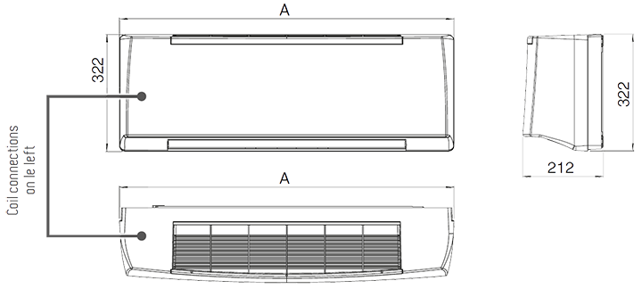 » Bobina: este fabricată din tub de cupru iar aripioarele de aluminiu sunt legate mecanic pe tub printr-un proces de expansiune. Bobina are două conexiuni interne BSP de 1/2 inch și ventilație și scurgere de aer BSP de 1/8 inch. Schimbătorul de căldură nu este potrivit pentru utilizare în atmosferă corozivă sau în medii unde aluminiul poate fi supus coroziunii. Conexiunile sunt doar pe partea stângă, îndreptată spre unitate.
