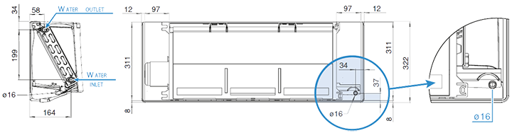 » Tava de colectare a condensului: din polipropilenă; diametrul exterior a conductei de evacuare a condensului este de 16 mm.